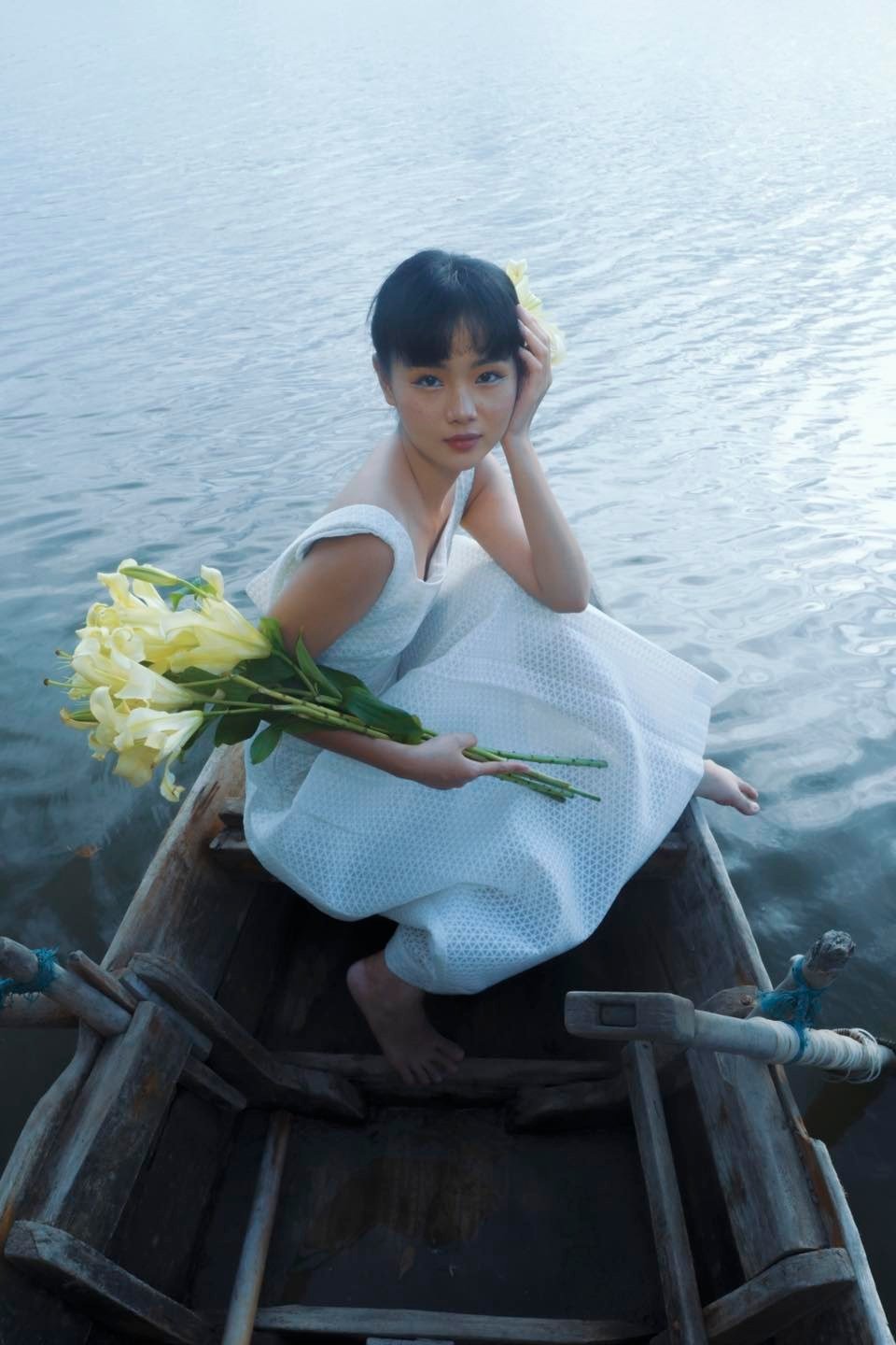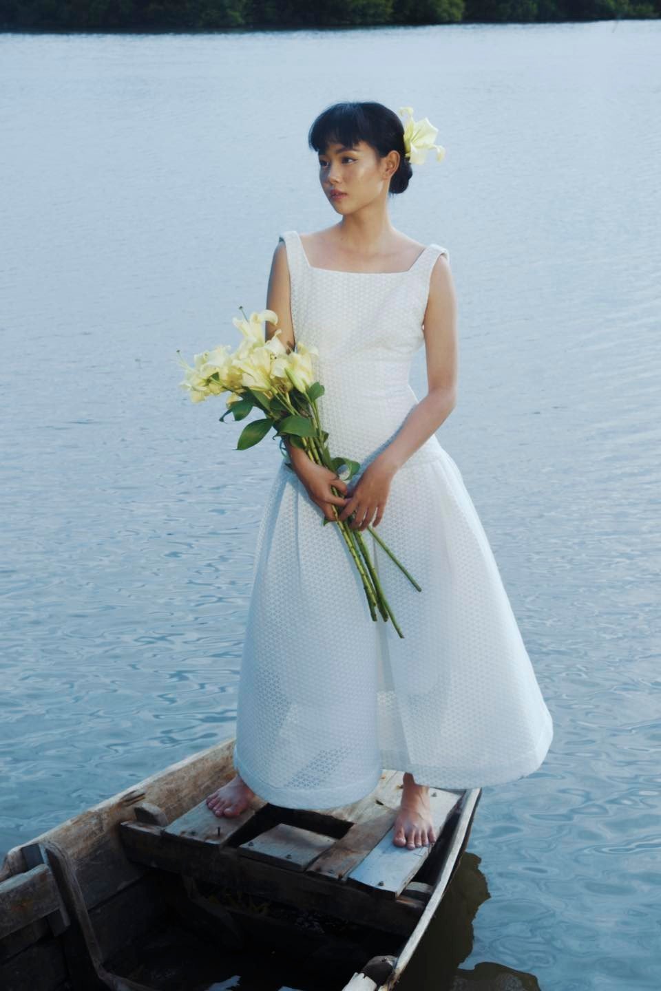 Design: Midi length, elegant square neckline, fitted waist to flatter the figure, flowing skirt resembling summer raindrops