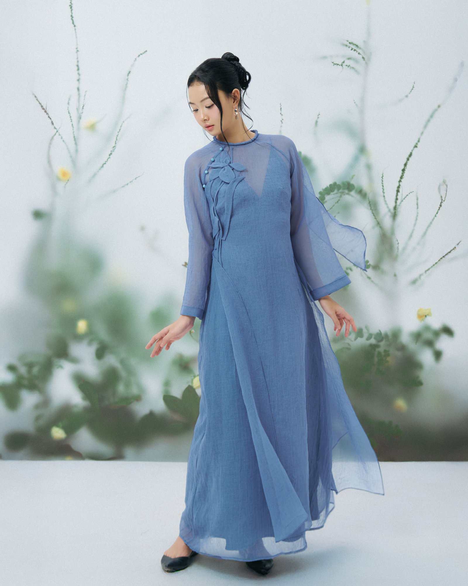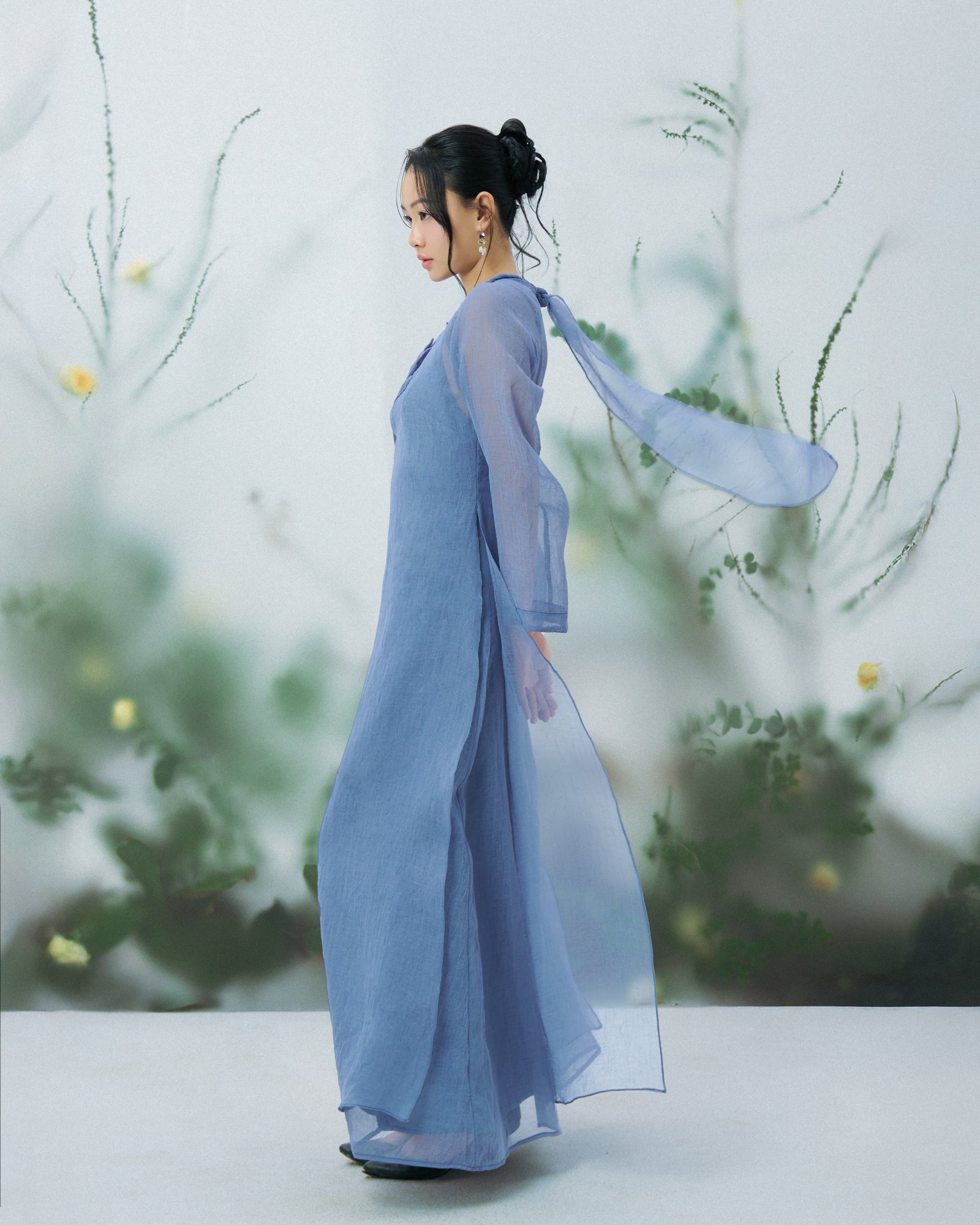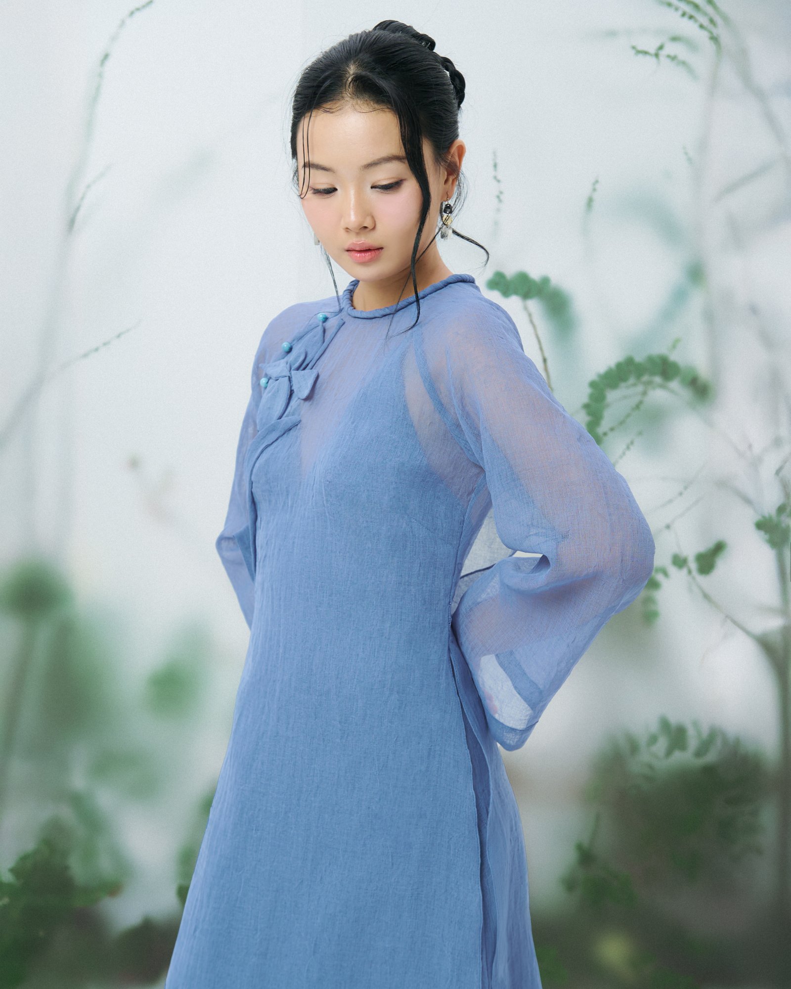 • Thiết kế: 1 áo dài được đính kết thủ công, 1 váy yếm bên trong cùng chất liệu lót lụa.