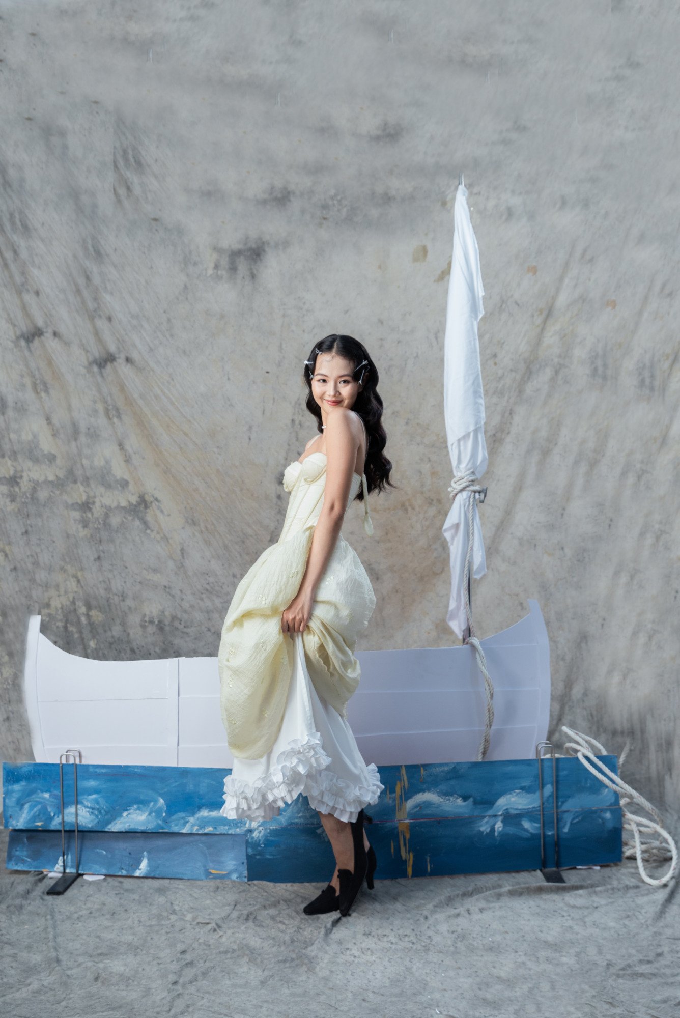 Thiết kế: Dáng váy như nàng thơ, duyên dáng và nữ tính. Phần thân trên là corset độc đáo, kết hoa xinh xắn ngay bên phải ngực, tôn lên vẻ đẹp dịu dàng và quyến rũ.