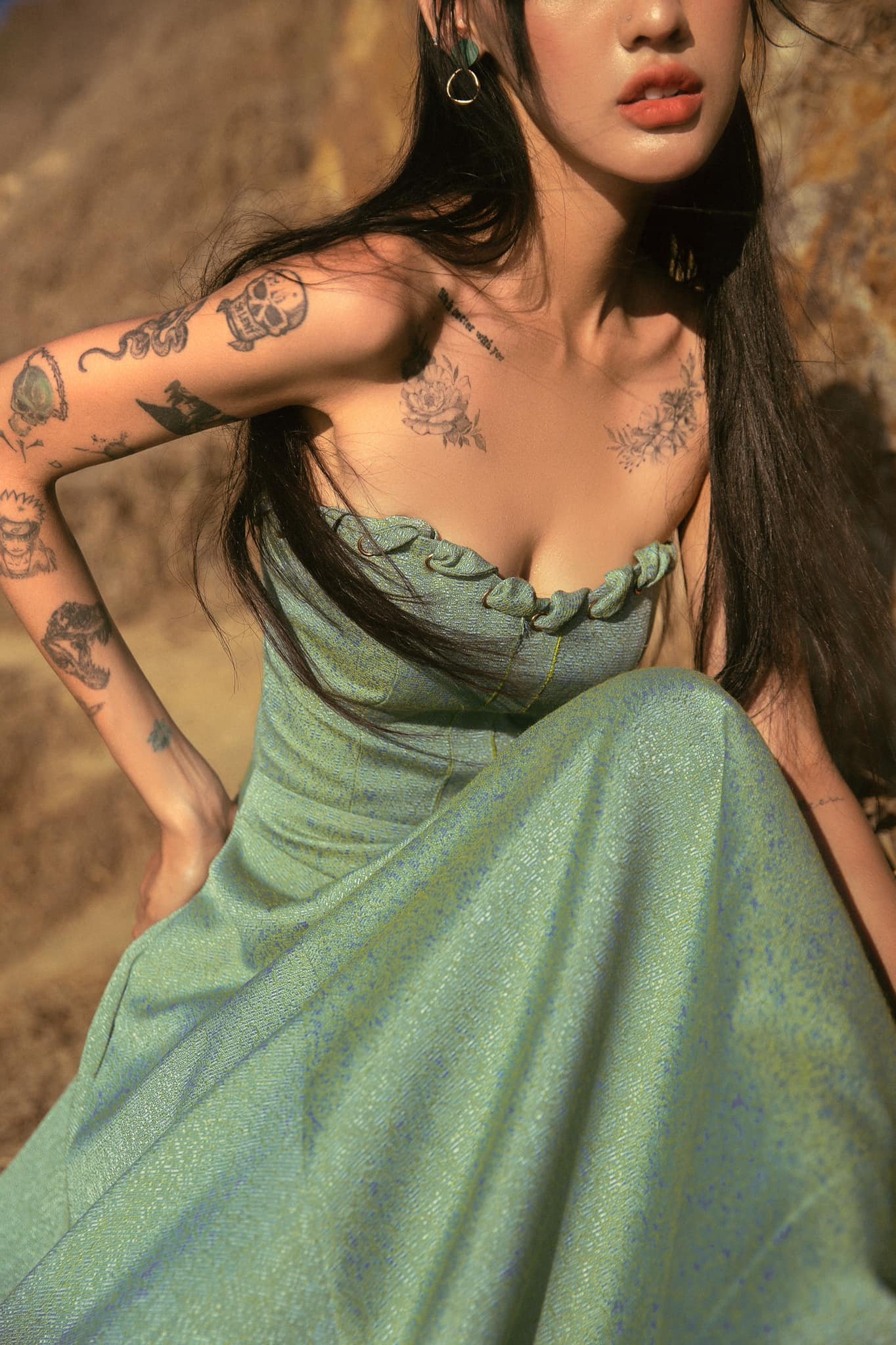 • Thiết kế: Dáng váy loe tinh tế, thân trên ghép mảnh cánh quạt. Chi tiết xoắn dây phần ngực gợi cảm hứng sóng biển, khoe bờ vai thon gọn mà vẫn giữ vẻ sang trọng.