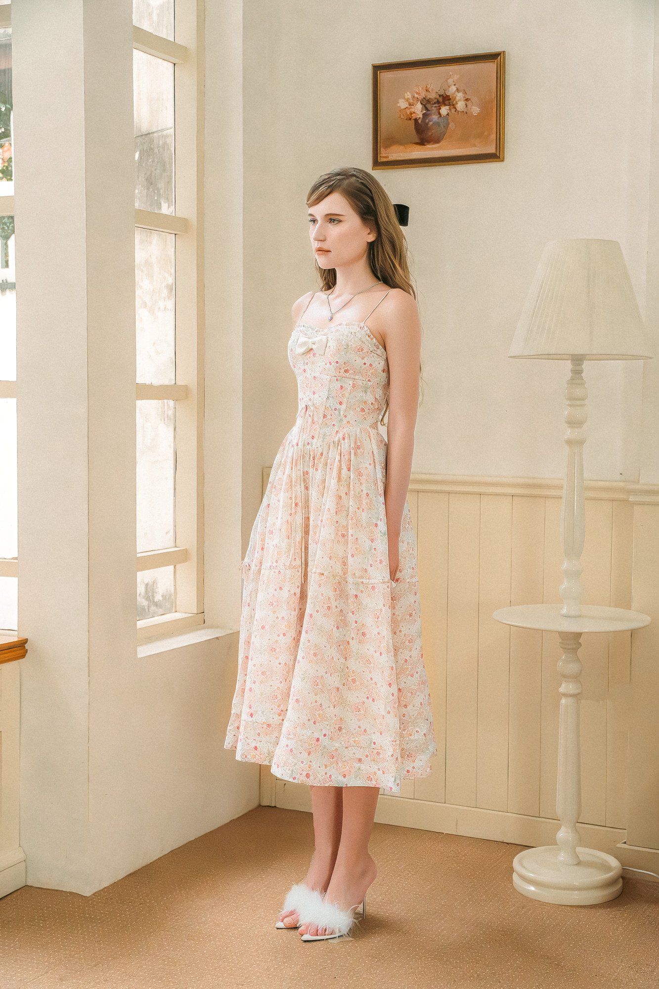 Thiết kế: Thân trên may 2 lớp, bèo nhún vintage; corset đính nơ tinh tế tôn vòng eo; dáng xoè nhẹ nhàng nữ tính.