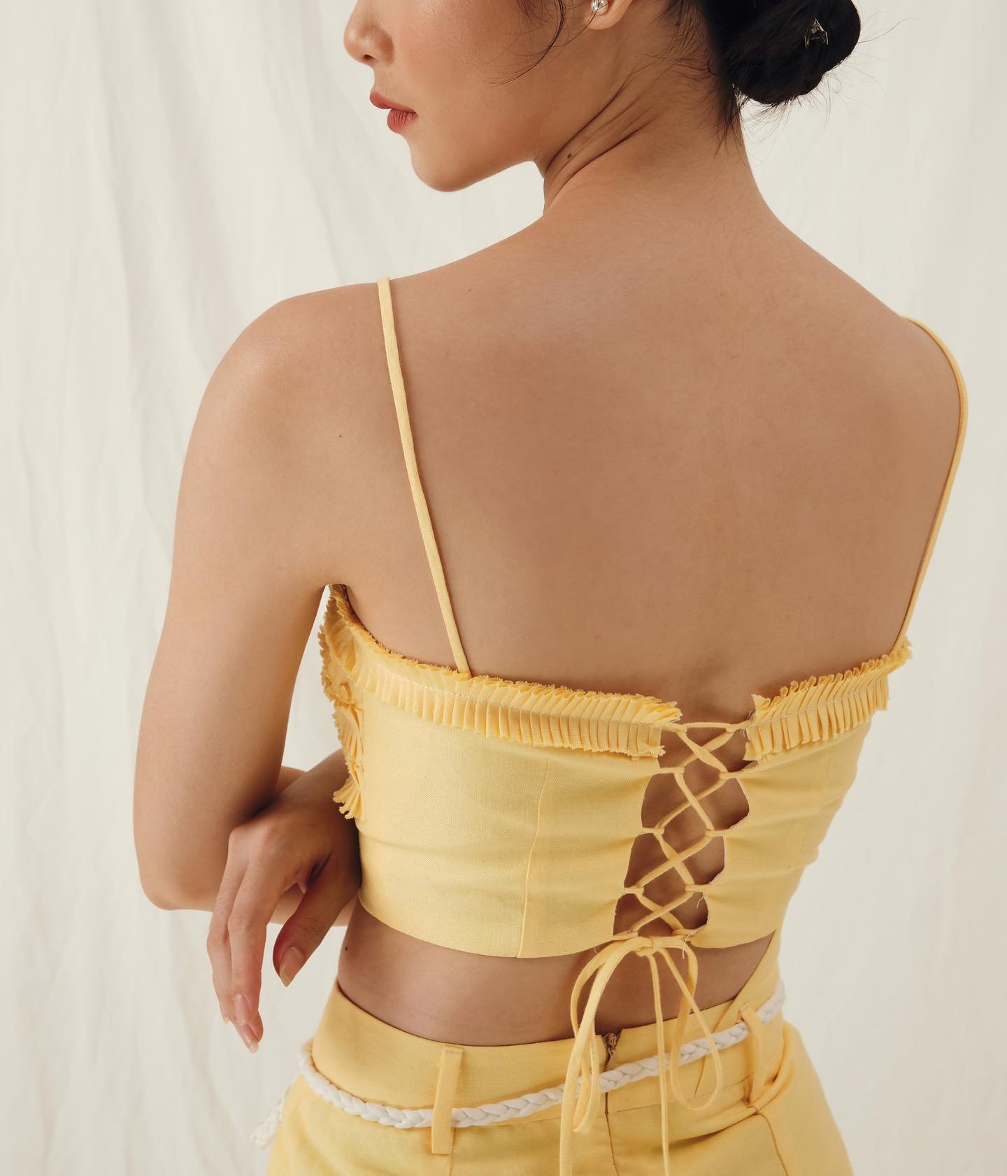 Thiết kế: Áo crop top dây mảnh với chi tiết xếp nếp nổi bật