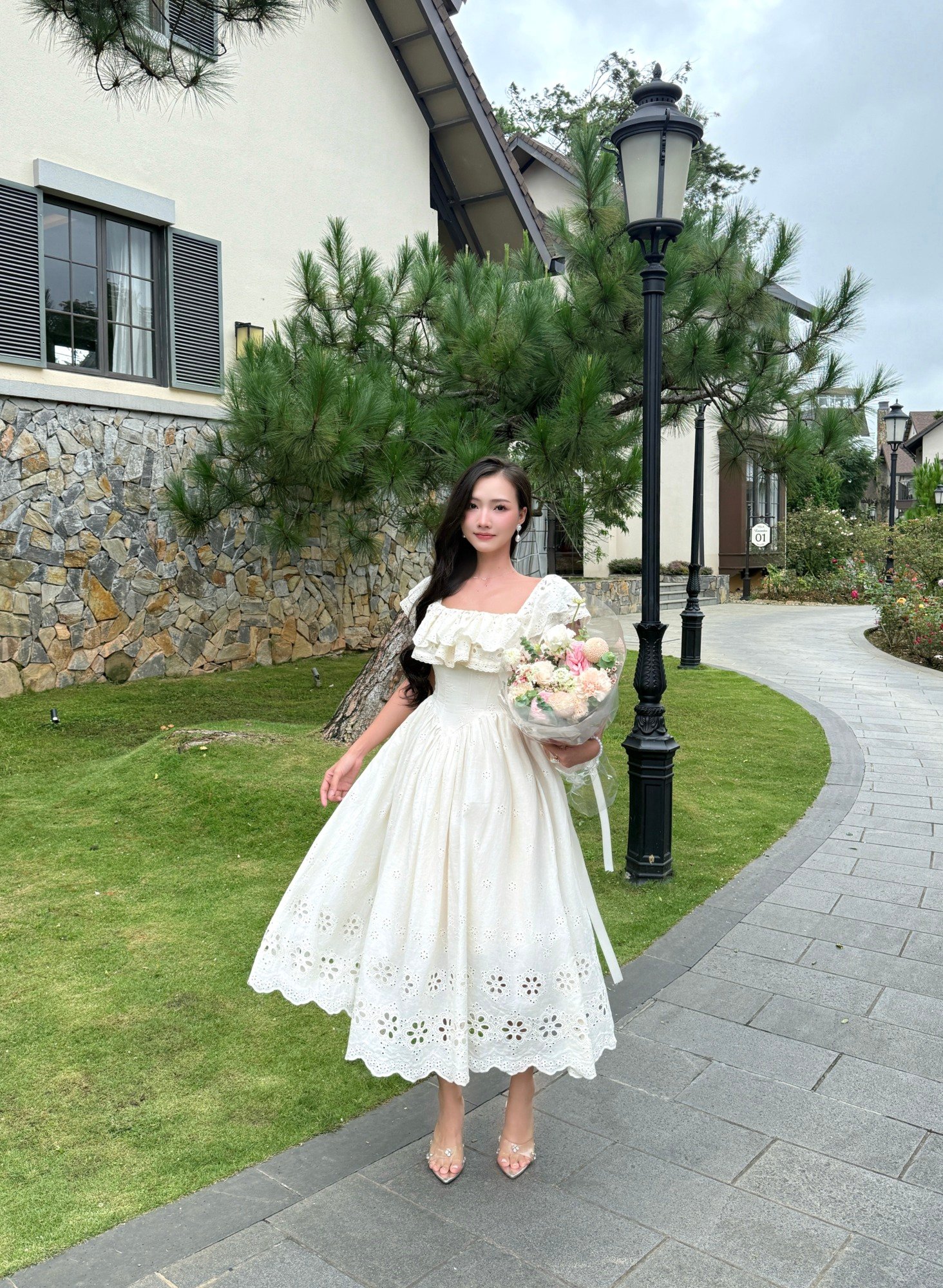 Dáng midi xoè nhẹ nhàng, vai trễ kết hợp bèo nhún nữ tính.