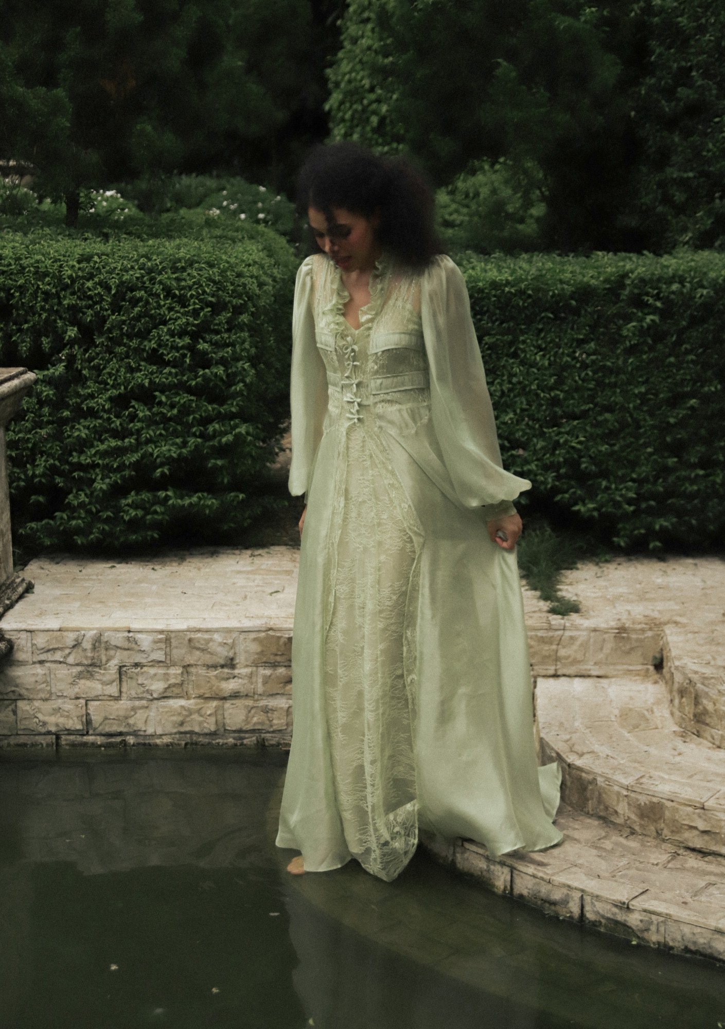 Chất liệu: Lụa mint mềm mịn kết hợp chiffon trong suốt và ren cao cấp.
