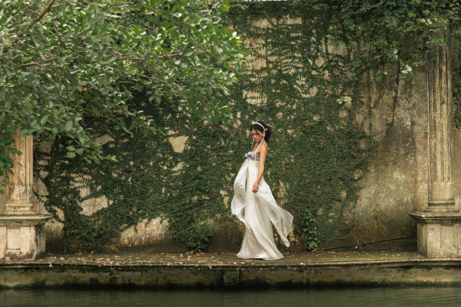 Thiết kế: Dáng đầm đuôi cá cổ điển, điểm nhấn nơ lụa tím lilac ở ngực, tôn nét nữ tính và lãng mạn.