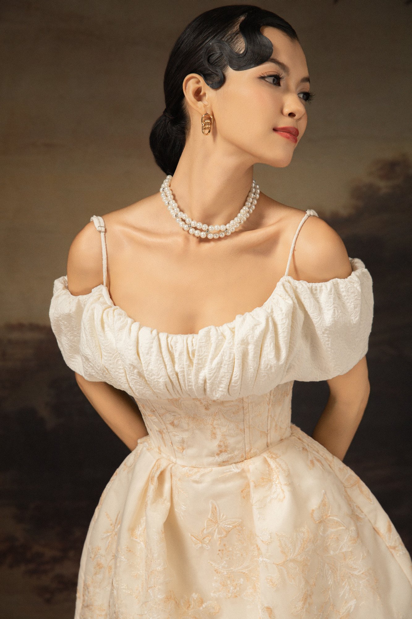 Vai trễ nữ tính, thân ôm vừa vặn.